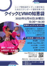 好評のシリーズ企画、第3回は種目をクイックステップとヴィエニーズワルツに絞って「クイックとヴィエニーズの知恵袋」を開催します。講師は前回と同じ、山嵜圭太・石本美奈子組にお願いしています。講習を受ける機会の少ない種目の踊り方のヒントを教えていただきます。今回がスタンダード講習会の最後になります。